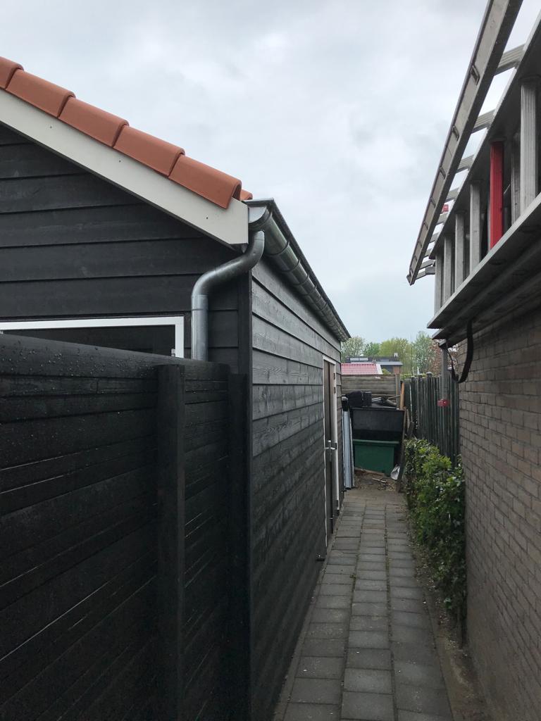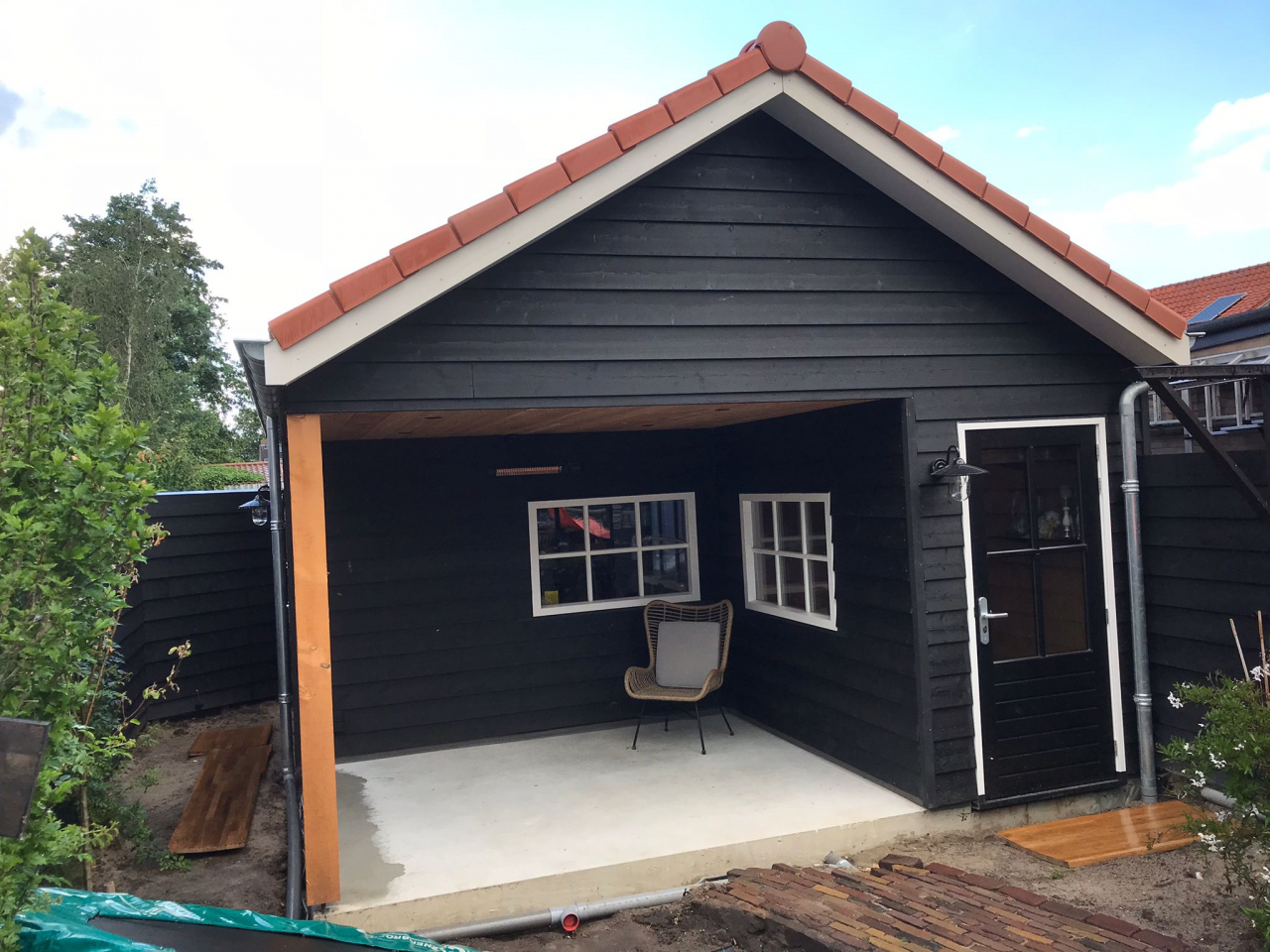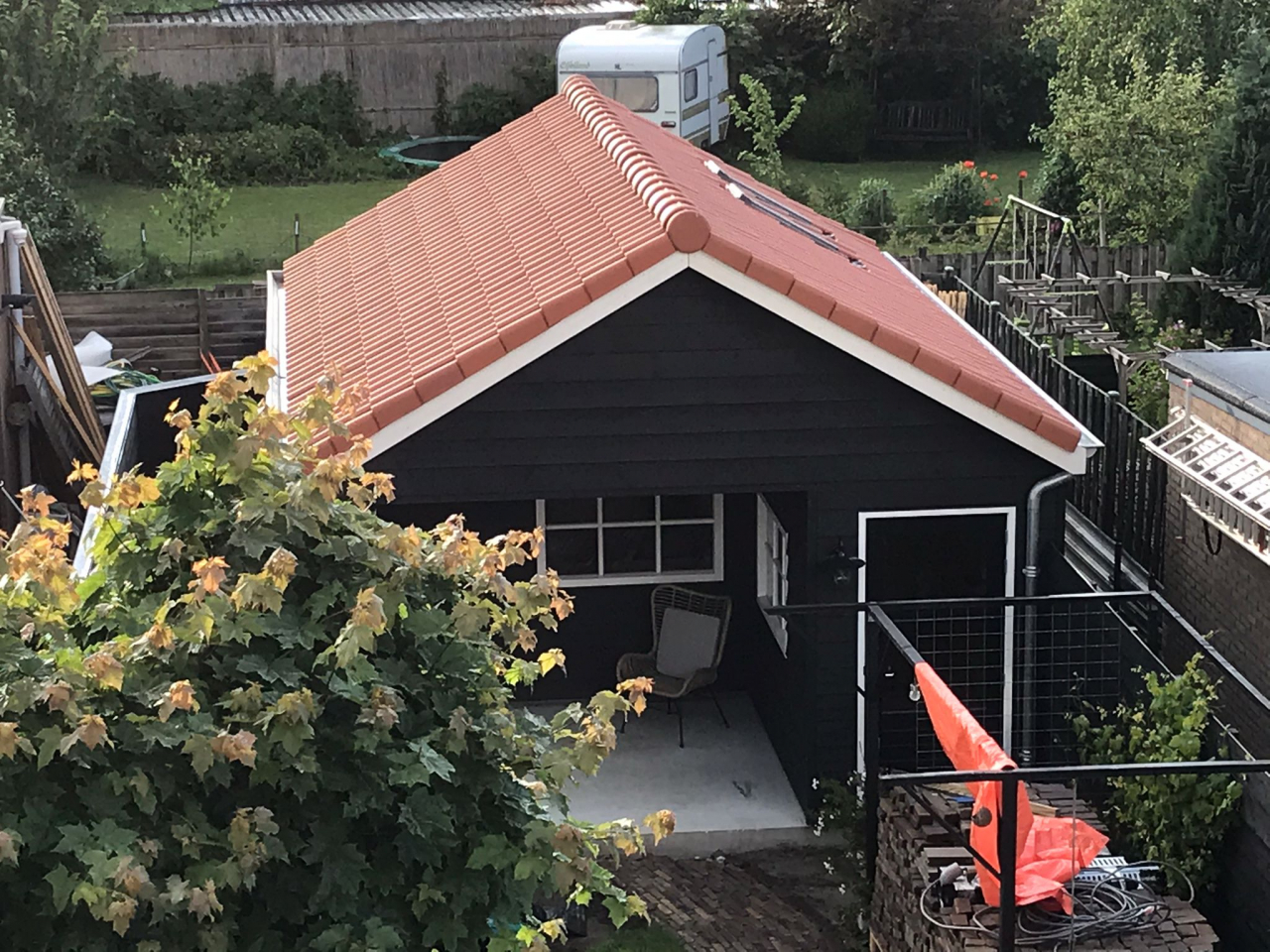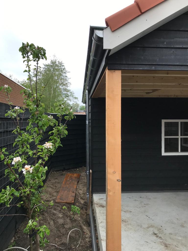 Een tuinschuur? Ja, dat is het echt. Plaatje hè?! In opdracht van Bouwbedrijf van Steenbergen bouwden wij deze houtskelet tuinschuur prefab en leverden deze af fabriek kant-en-klaar op locatie, waar de schuur met militaire precisie in deze smalle tuin in Zaltbommel werd opgebouwd door de opdrachtgever. En het resultaat mag er wezen! Een strakke eigentijdse tuinschuur door de zwarte rabatdelen gecombineerd met naturel hout en de terracotta dakpannen. Functioneel en een verrijking van je tuin.