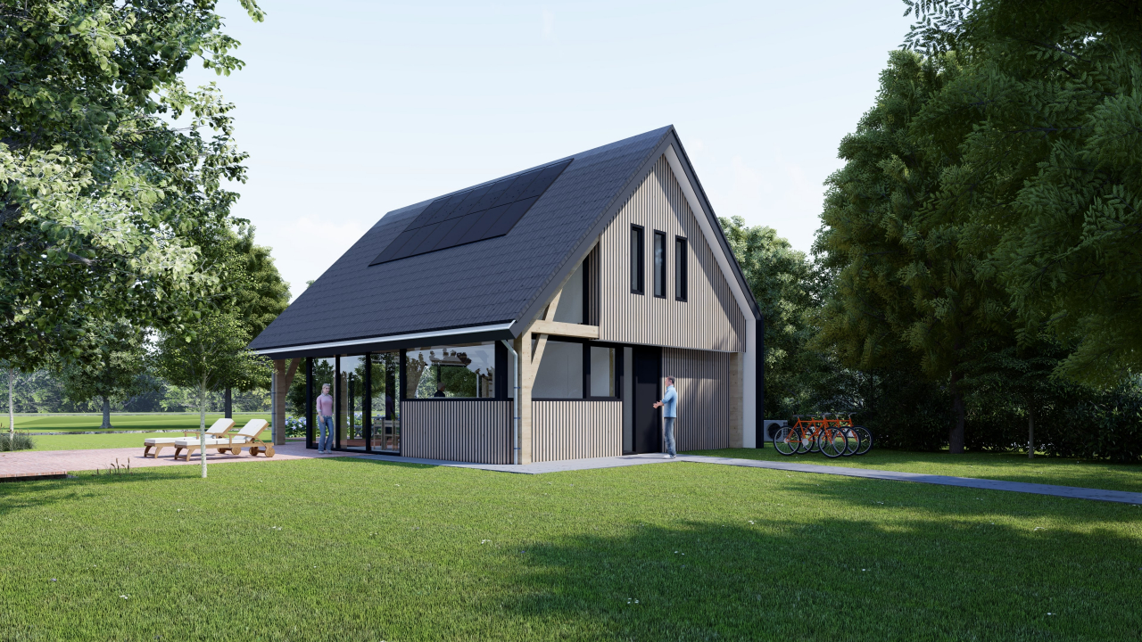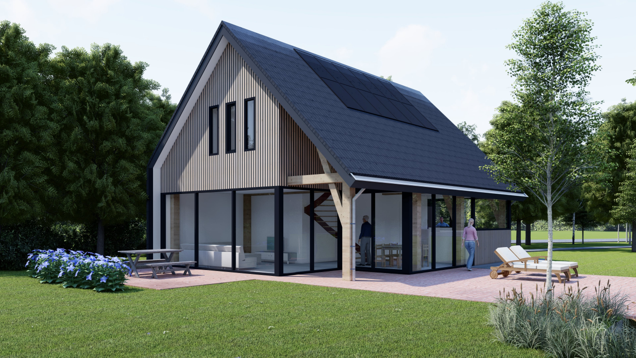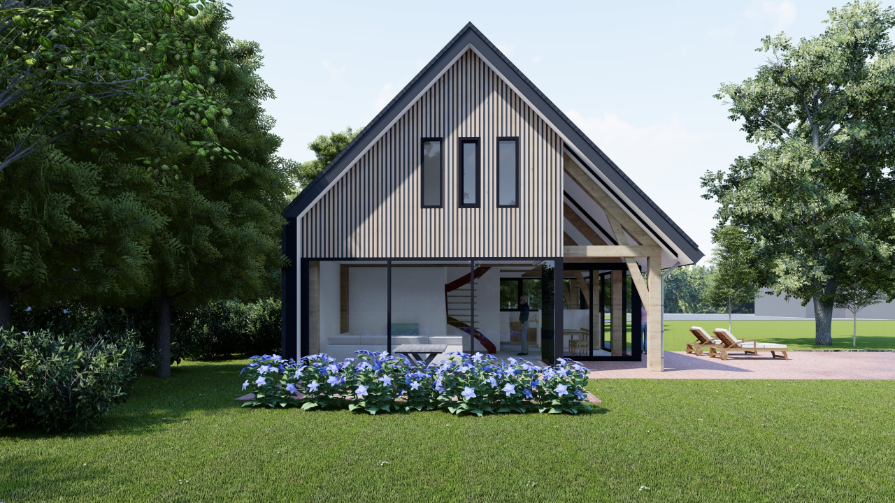 In het ontwerp van deze aan een pluktuin grenzende schuurwoning staat de benedenverdieping centraal. De volledige benedenverdieping bestaat uit ramen wat het mogelijk maakt om vanuit elke hoek in huis naar buiten te kijken. Hierdoor wordt de woning als het ware één met de natuur.