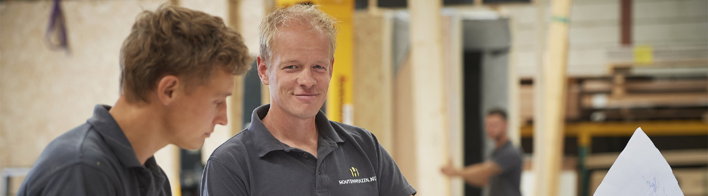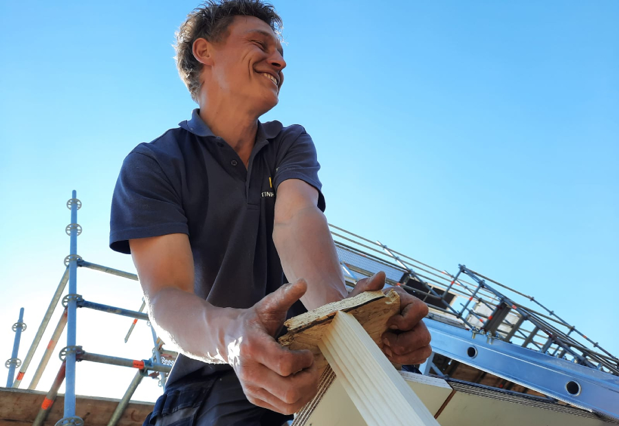 Als alle onderdelen van het houten huis op locatie zijn afgeleverd, dan is de montageploeg als eerste ter plaatse. Zij zorgen ervoor dat de woning binnen twee weken wind- en waterdicht is. En dat is moment waarop jij met jouw werkmaat uit de startblokken komt om aan de slag te gaan met de afbouw van het houten huis.